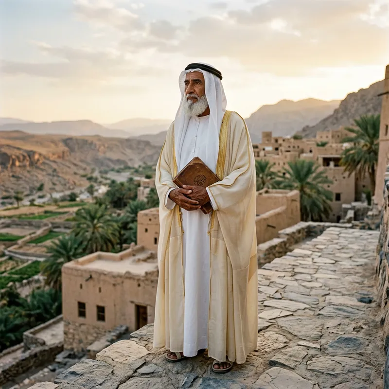 An image of a wise, dignified and respectful Arab man. The image is full-length, and the man is gazing off into the distance. His attire mirrors his cultural background, showing a traditional garb of flowing robes. His eyes carry a certain depth to them, almost as if they contain a wealth of wisdom from years of experiences. In his hand, he holds an old book, a symbol of his wisdom. Details such as his weathered hands and the soft lines on his face subtly suggest his age, while his upright stance and confident gaze show his respectability.