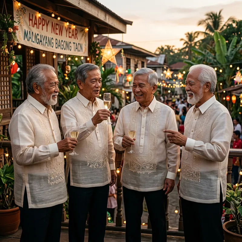 A hyper-realistic image of four wise individuals, reminiscent by their look, pose and demeanor of famed philosophers and figures from antiquity and fiction, all standing together in traditional Filipino Barong. They are sharing a moment of celebration, wishing a Happy New Year. To preserve their anonymity, not one of them resembles any particular real or fictional person, but rather they give off an aura of wisdom and stoicism. Their expressions and clothing are intricately detailed and realistic, vividly showcasing the weave and embroidery of the Barongs.