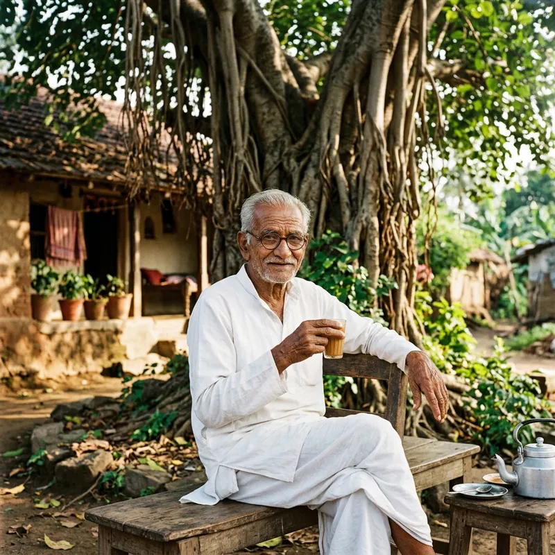 An elderly South Asian man with deep wrinkles etched onto his face, creating a map of a lifetime of experiences. His hair is a silver white, thin but still present, combed back neatly. He has thoughtful, wise eyes, peering out from behind a pair of round spectacles. Dressed traditionally in a clean, white dhoti and kurta, he radiates a sense of contentment and peace. He might be sitting outside his house, maybe under a banyan tree, sipping chai.