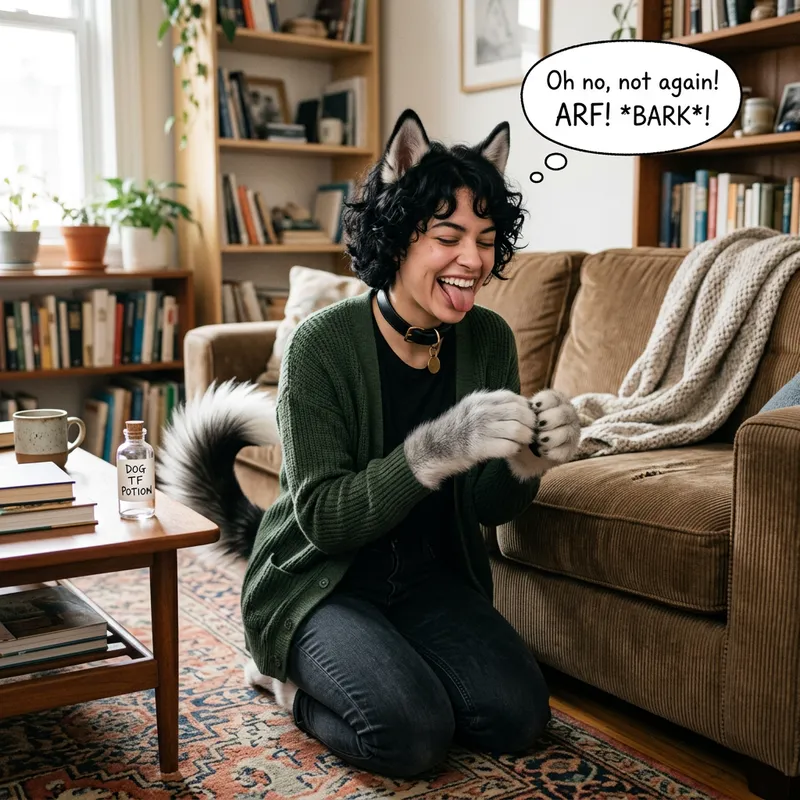 Witch transformation into a dog husky, in home, dog nose,fur ,happy become pet,sexy,fur, muzzle,dog ears, dog tail, black hair short hair ,tonuge out,fur body,fluffy tail, arf,collar,bark,oh no not again, dog tf potion,furry,dog tail,antromorph, dog girl,transformation, anthromorph, transformation, happy become dog, dog fest ,fur body,
