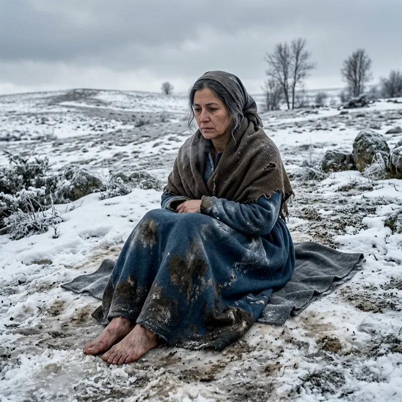 A woman of unspecified descent, wearing a soiled gown, is barefooted. She is seated on a patch of unclean snow. The icy landscape surrounds her, and the chill is present in the atmosphere. The dirt on her clothes match the dirty snow, evidencing her struggles and perhaps a journey through the snow that she had to endure. The stark whiteness of the frosty landscape contrasts strongly against the dark soil stains on her dress and the snow where she sits.