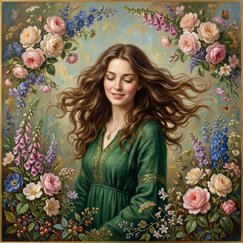 An image of a woman with spinning hair, surrounded by beautifully painted flowers. The composition of the scene is flawless, with meticulous details added into every corner, creating an overall masterpiece. This picturesque portrait gives off a vibe of beauty, tranquility, and harmony at every glance.