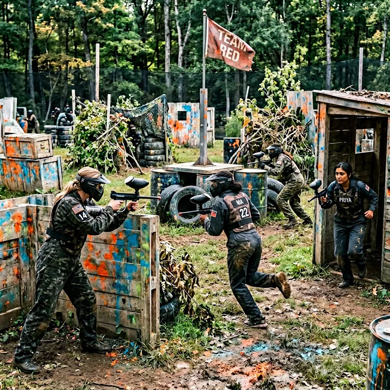A group of women immersed in a lively paintball game. Each player is outfitted in safety gear, including helmets, protective vests, and full-length jumpsuits. A Caucasian woman is taking cover behind a barricade, aiming her paintball marker at an African American woman who is sprinting across the field. A South Asian woman is bolting out from a dugout, whilst a Hispanic woman is tactically moving towards the flag post. The arena is outdoors, littered with wooden crates, barrels, and natural hides made from branch and leaf. Paint splatters color the ground and the barricades, evidencing the intense game in progress.