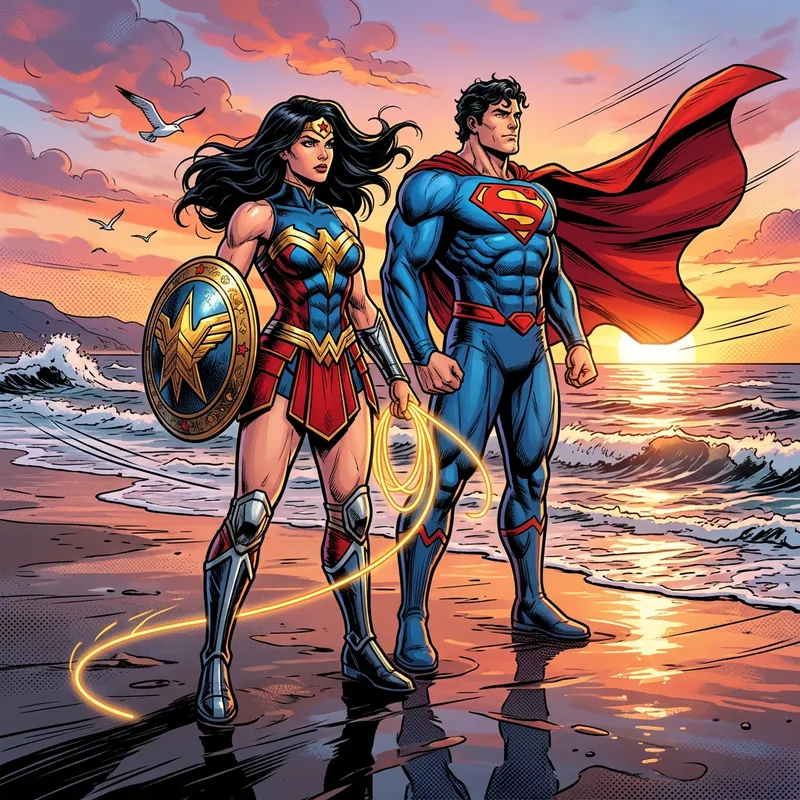 Wonder Woman and Superman at the Beach in Comic Style