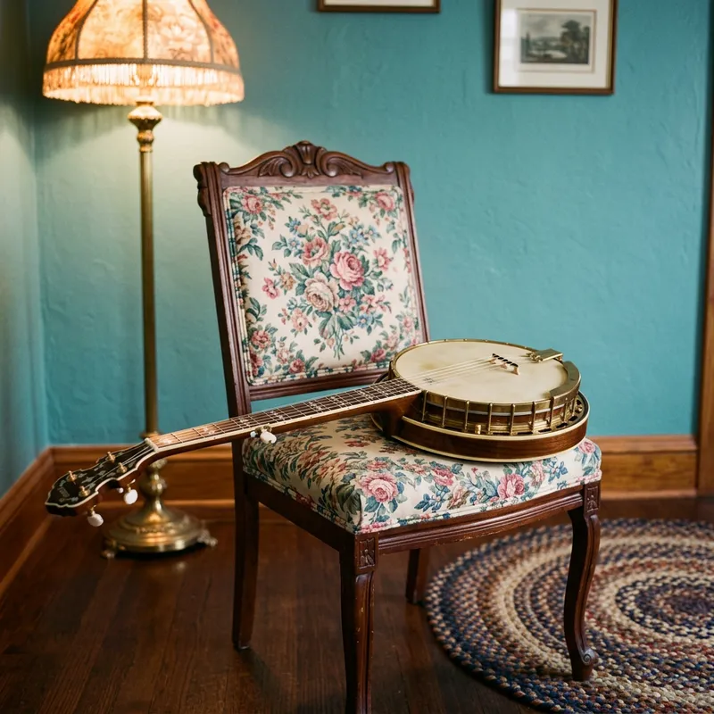 A finely crafted wooden banjo rests on an antique chair. Its strings are neatly strung, reflecting the ambient light in the room. The chair is upholstered with a chintz floral pattern, adding a touch of vintage charm to the scene. The chair sits against a calm, oceanic teal colored wall, creating a soothing backdrop. A warm glow from a nearby Victorian floor lamp illuminates the banjo, highlighting its polished surface and intricate inlays. Positioned next to the chair, a round braided rug in rustic hues of brown and navy anchors the scene, offering an inviting home-like atmosphere.