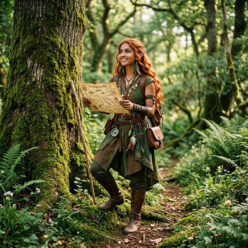 A South Asian female woodland elf with luminous copper-colored hair that falls in loose waves down her back. She is remarkably passionate about exploring. Her bright green eyes, full of curiosity, gleam in the soft forest light as she gazes at the nature around her. Dressed in earthy tones and adorned with trinkets like feathers and gems that she's picked up on her explorations, the elf stands confidently near a moss-covered tree, one foot pointed towards the unknown, ready to set off on her next forestry adventure. She carries a small, detailed map in her hands, evidence of her wanderlust.