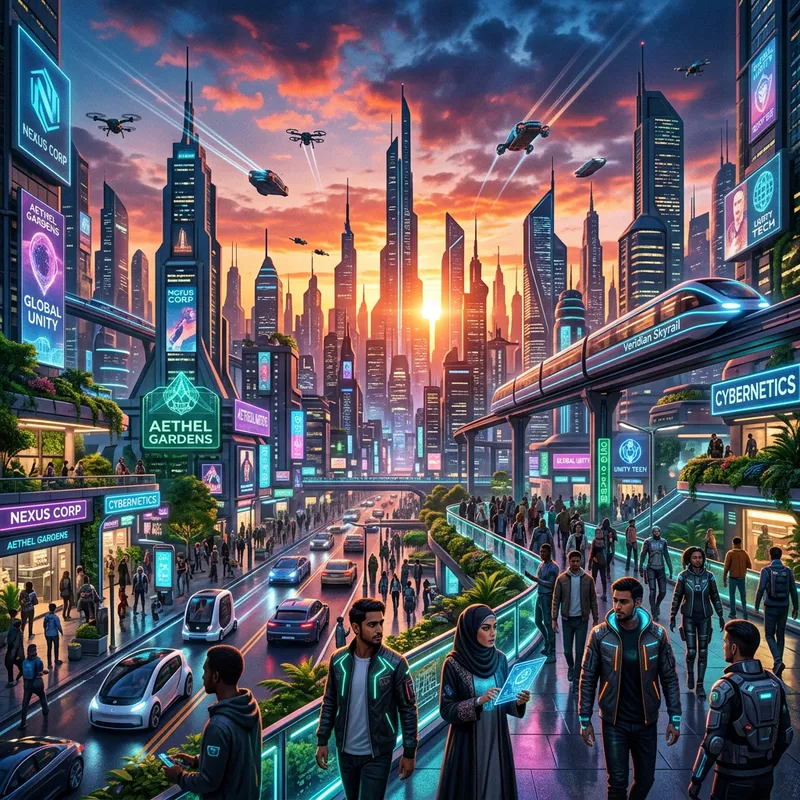 A depiction of a futuristic, world-class sci-fi setting. This cityscape features towering skyscrapers with luminescent holographic billboards, neon lit streets bustling with diverse characters from every descent including Caucasians, Hispanics, Blacks, Middle-Eastern, South Asians and Whites. Drones zoom overhead in the iridescent skyline, while advanced monorail systems weave through the city. Pedestrians are seen, both men and women, donned in advanced wearable tech clothing representing different professions, hinting at a highly advanced society. Spot autonomous vehicles darting down streets, surrounded by lush greenery showcasing the perfect blend of technology and nature. Finish the scene with a mesmerizing sunset forming a silhouette of the futuristic architecture.