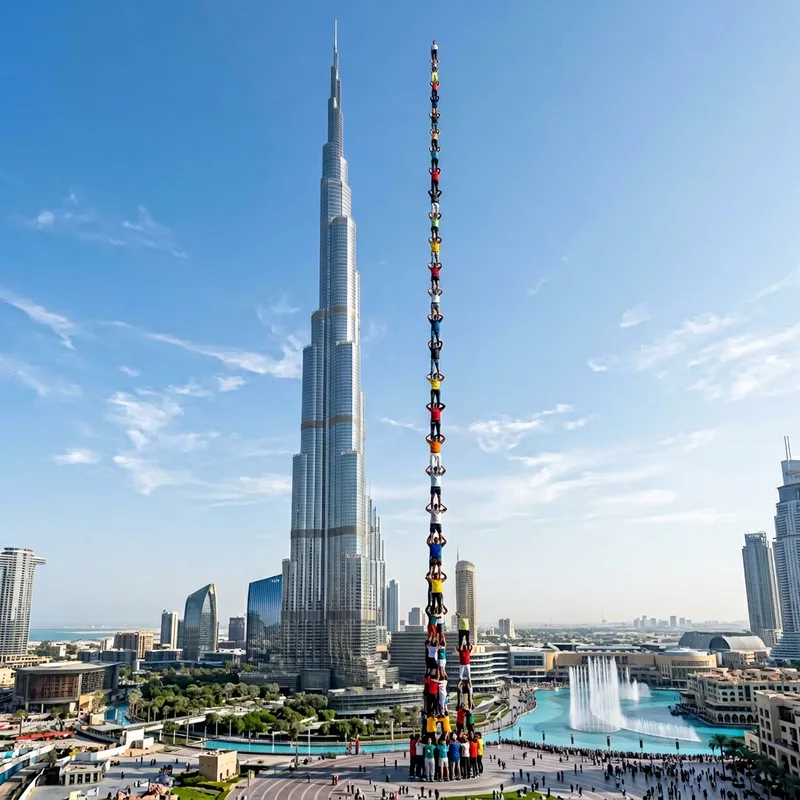An image displaying the world's tallest building standing majestically under a clear-blue sky. Next to it is an extraordinary spectacle: a line of people, organised in an awe-inspiring vertical stack reaching all the way to the top of the building. They are arrayed one above the other, not in a pyramid shape but in a single, linear formation. Each individual, regardless of their descent or gender, contributes to this human tower, showcasing strength, balance, and unity.