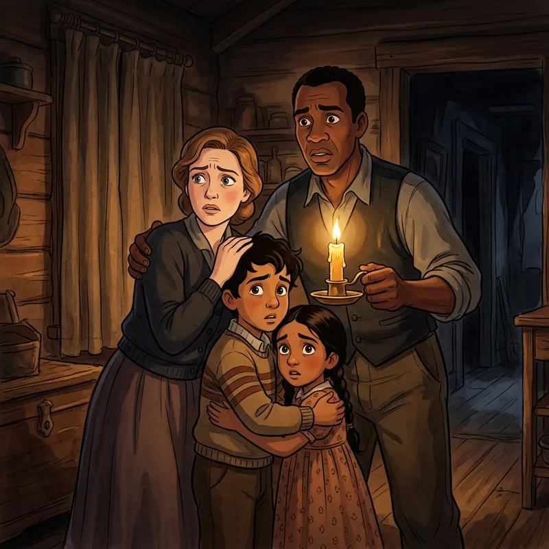 A worried family in the style of Disney's early 20th century animations, holding a single candle. The family consists of a mother, a father, and two children of diverse ethnicities. The father, a Black man, is holding the candle while his Caucasian wife is clinging onto his arm. Their children, a Middle-Eastern boy, and a South Asian girl, both share wide-eyed expressions of concern as they huddle close to their parents. All are situated in a warmly lit room, casting soft shadows on their faces, reflecting a sense of urgency and suspense.