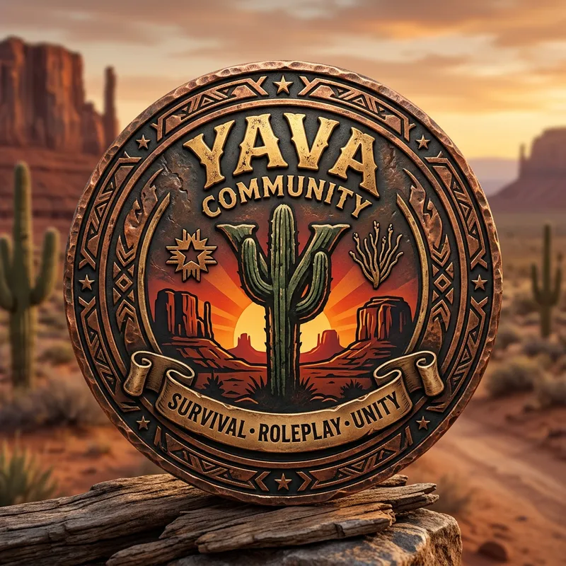 Design an emblem or symbol for a player community in the multiplayer online game set in the desert landscape of Arizona, specifically role-playing with the theme of 'Yava.' Please note this should not imitate any existing logo but draw inspiration from the environment, role-playing theme, and the spirit of cooperative online gameplay. Avoid using any copyrighted images, characters, or symbols.