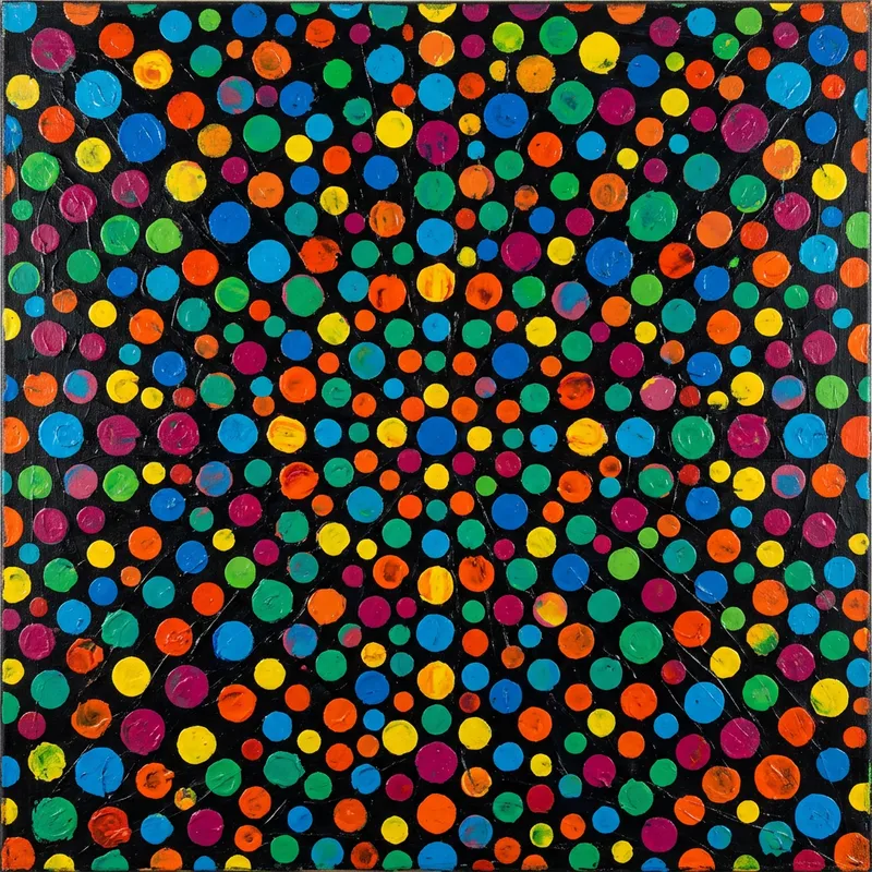 Create an image with a pattern of vibrant polka dots against a contrasting background, invoking the feeling of infinity and self-obliteration. The design style should be imaginative, energetic, and bold, reminiscent of the art movements around the mid-20th century. The primary medium is acrylic.