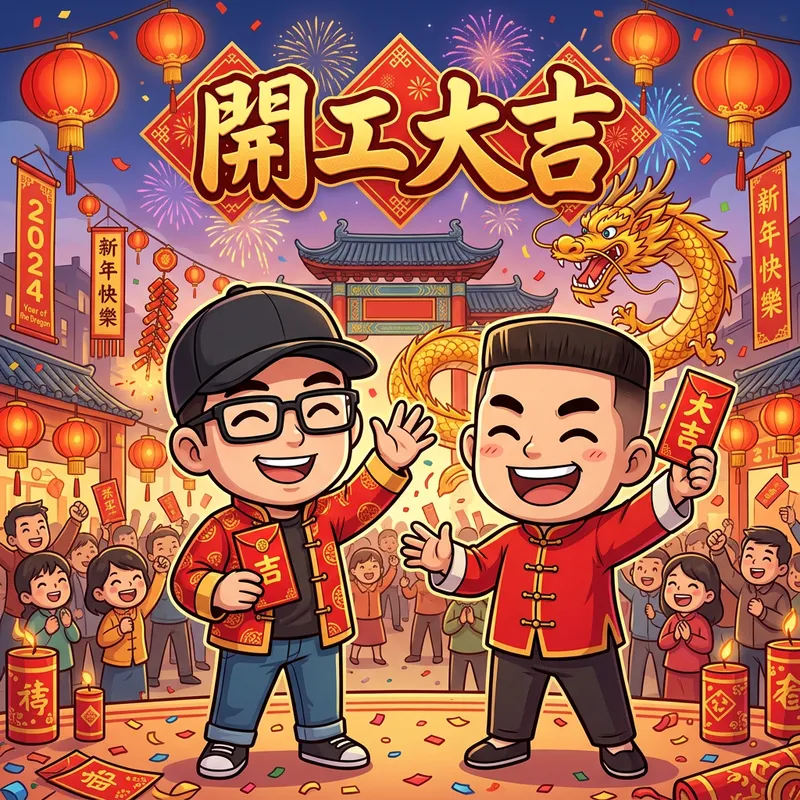 Create an 16:9 image that portrays the joyfulness of the year of the dragon during a grand new start. Include two cartoon characters holding red envelopes, wishing everyone well. A very apparent phrase, '開工大吉' should be interspersed in the image. One of the characters is a male with black rectangular glasses and a black baseball cap - do not include any text on the cap. The other character has a flat brush haircut, wearing a shirt, but without any text.