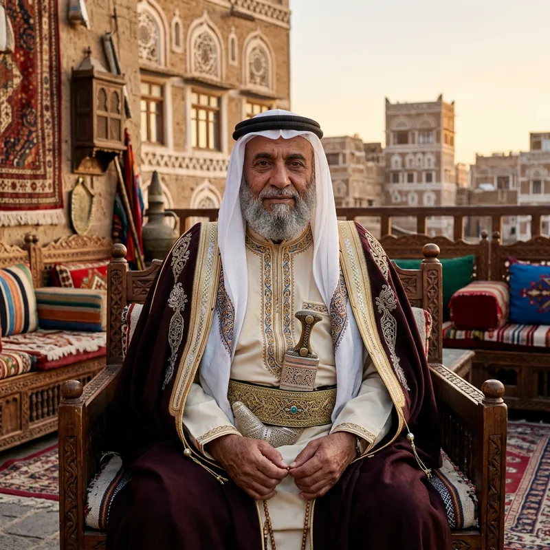 A dignified and majestic Yemeni sheikh in traditional attire. His gaze is filled with wisdom, his posture radiates nobility. His clothes are rich in color and display a deep cultural heritage.