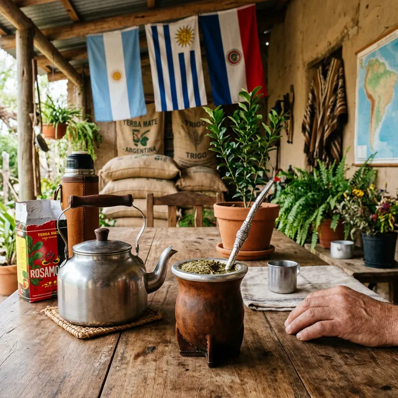 An image showcasing a typical Yerba Mate drinking setting. On the table is a hollow, round gourd with the Yerba Mate leaves inside. Next to it, there's a silver kettle filled with hot water. Also present is a metal straw, or 'bombilla', traditionally used to sip the beverage, with intricate designs etched onto it. In the background, some South American elements like flags, grain sacks, and native plants, to give an ambiance reminiscent of the drink's origin.