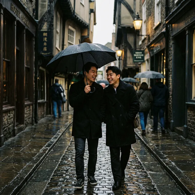 Two young, Asian men standing in an old, gloomy street under the light rainfall. They are laughing and enjoying each other's company. One of them is holding a black umbrella, protecting them from the rain. They both are wearing black coats, adding to the old-world charm of the scene.