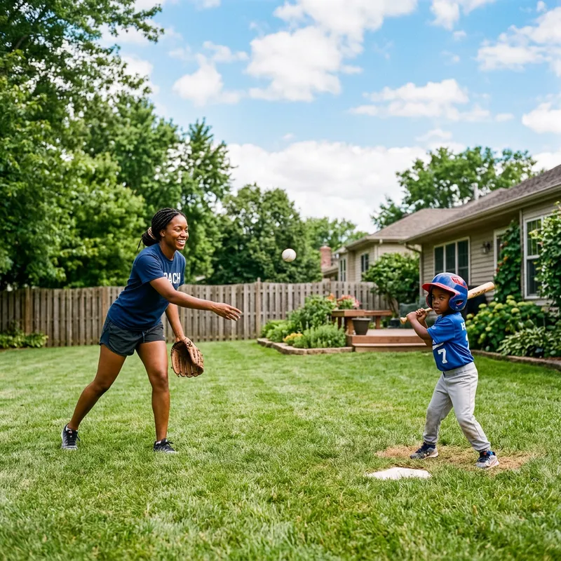 A young African American mother stands in an expansive, grassy backyard under a bright blue sky. She is wearing a baseball glove and is in the middle of a smooth, practiced pitching motion. Her face is full of concentration and encouragement. At a suitable distance away, stood her 5-year-old son. The young boy, characterized by an aura of determination and excitement, grips a small baseball bat, his eyes focused intently on the incoming ball. It's a touching scene, celebrating the beauty of mother-child bonding moments and the simple joy of teaching and learning new skills.