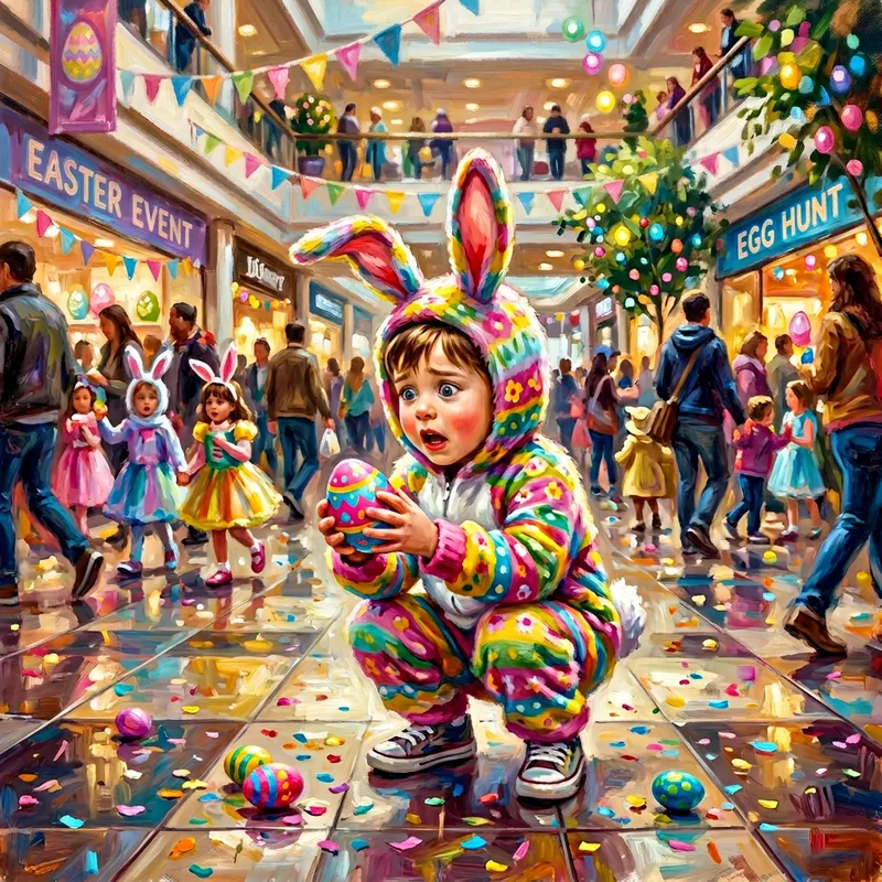 A young boy in a rabbit costume, painted with vibrant spring colors, is desperately trying to find his Easter egg in a crowded shopping mall. The scene takes on the style of impressionism with blurred backgrounds. His face depicts a look of surprise. The perspective is as if taken from a professional DSLR camera with a wide-angle lens, f/1.8, 24mm. It's a joyful Easter event.