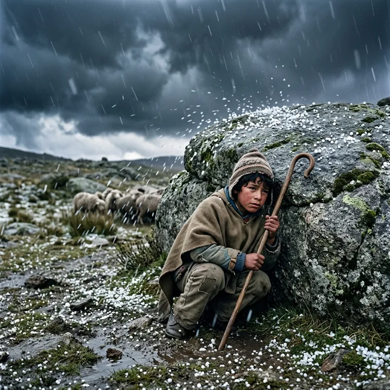 A young Hispanic boy, acting as a shepherd, is hidden behind a large rock. The sky is grey and filled with tumultuous and dark clouds. A heavy hailstorm is falling, with small icy pellets cascading down from the sky, bouncing off the top of the rock and onto the ground around him.