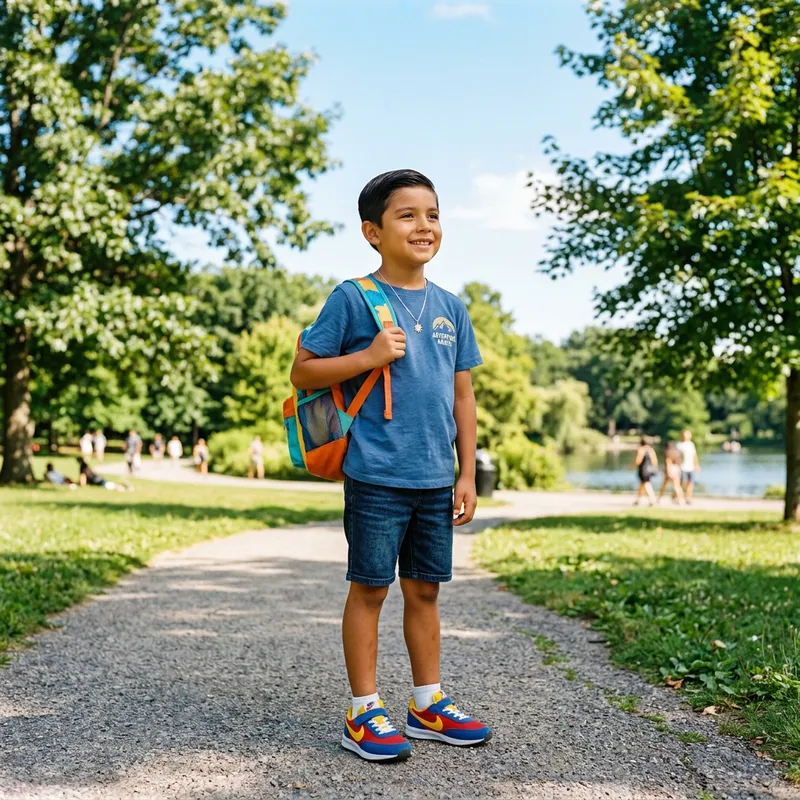 A young Hispanic boy wearing casual clothes and trainers, standing in a summer park with trees and a clear sky in the background. He is looking optimistically into the distance, his dark hair neatly combed, and a delicate charm necklace around his neck, which is caught by the sun. He has a small, brightly colored backpack visible on one shoulder, suggesting he is on a fun and adventurous day out.