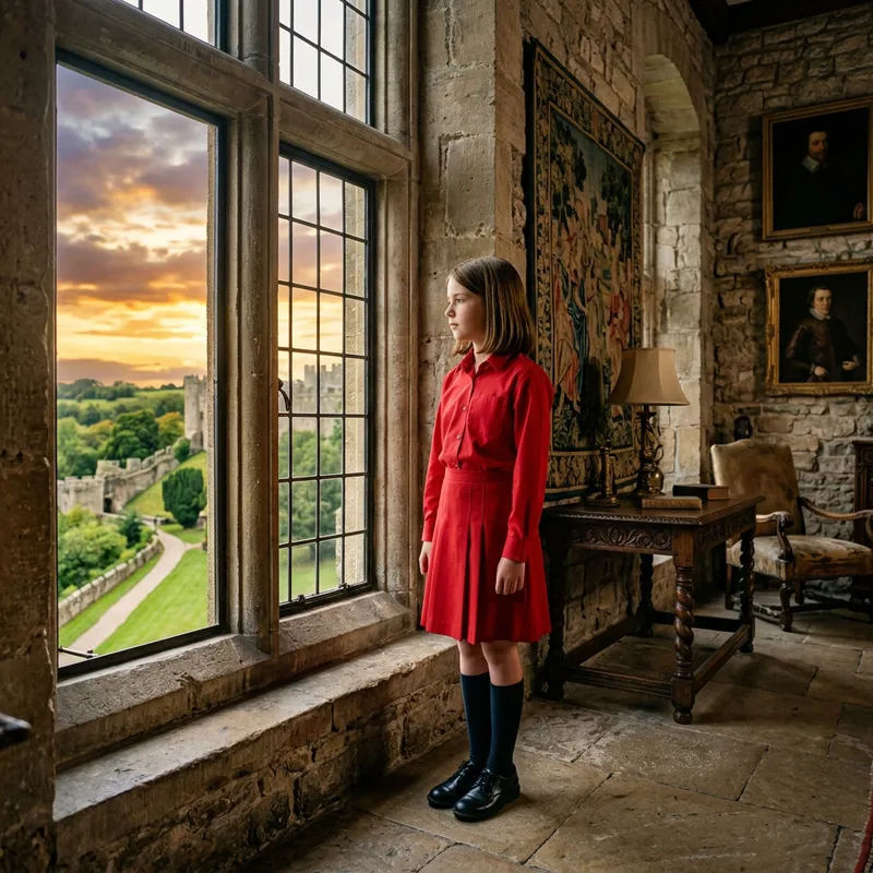 Image of a young Caucasian girl with brunette hair, standing in a grand, stone-built castle. She is wearing a basic red uniform, consisting of a neat button-up shirt, a straight skirt reaching to her knees, and polished black shoes. She carries a sense of seriousness and responsibility as she gazes out of a large window that overlooks the verdant castle grounds. The ambient light of the setting sun illuminates the room revealing antique furniture, rich tapestries, and historic portraits hanging on the walls.