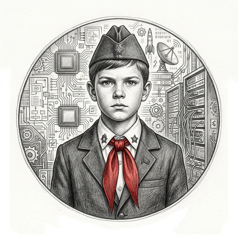 A graphite pencil sketch of a young Eastern European boy, captured in a circular frame set against a white background. The boy stands in a pioneer outfit, complete with a flat cap known as a pilotka and a vibrant red tie. He faces straight forward, his expression clear and determined. Intricate textures and details echo in every crevice, lending the image a realistic feel. In the background behind the boy, a montage of technology elements forms a symbolic backdrop. Schematics, servers, and microchips intertwine, casting an aura of technological advancement.