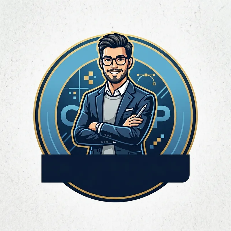 Young, fit, modern professional mascot with glasses, a subtle mustache, and a bordered beard, wearing modern attire, suitable for a graphic design logo.