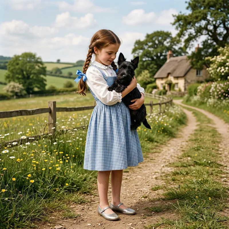 A fictional character resembling a young girl from the late 19th century. She has brown hair styled in two braids, adorned with a blue bow. Her apparel comprises a white blouse and a blue gingham dress. She is also wearing silver shoes. This character is depicted in an idyllic rural setting with a small black terrier dog in her loving embrace.