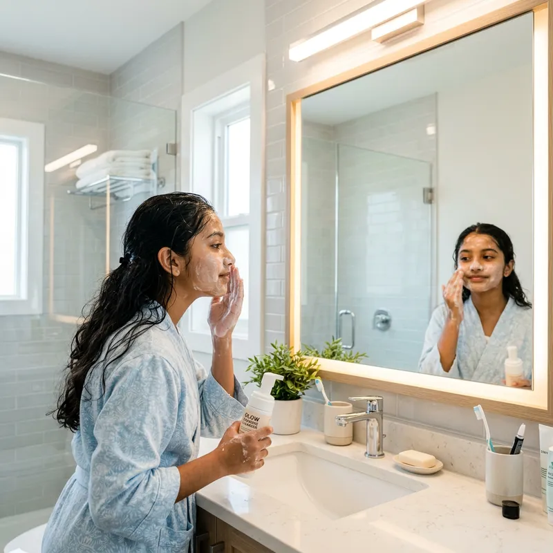 A young South Asian girl with long, wavy black hair, in a brightly lit bathroom. She is standing in front of a mirror, applying face wash to her clean and damp face. She is wearing a comfortable cotton robe. In her hands, she holds a bottle of foaming face wash. The bathroom setting is serene with light-colored tiles and a bright overhead light. The mirror reflects her focused expression as she carefully massages the face wash into her skin.