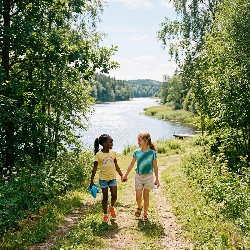 An image of two young girls walking towards a river. One girl is Black and the other is Caucasian. Both are dressed in casual summer clothes - shorts and T-shirts. The day is sunny and the river is shimmering in the distance. There are lush green trees on either side of them, creating a picturesque atmosphere. The girls seem cheerful and anticipating a splash in the cool river water. The scenery is peaceful and serene.