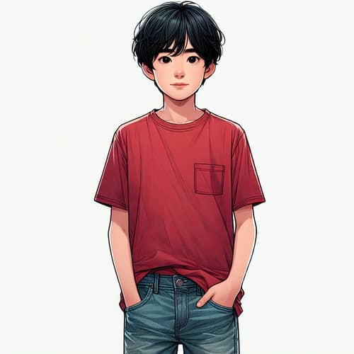 A young Hispanic boy standing in a frontal pose. He is wearing a deep red hoodie and blue denim jeans. His shoes are white sneakers. He is set against a plain white background. He is pointing at something. He has short hair.