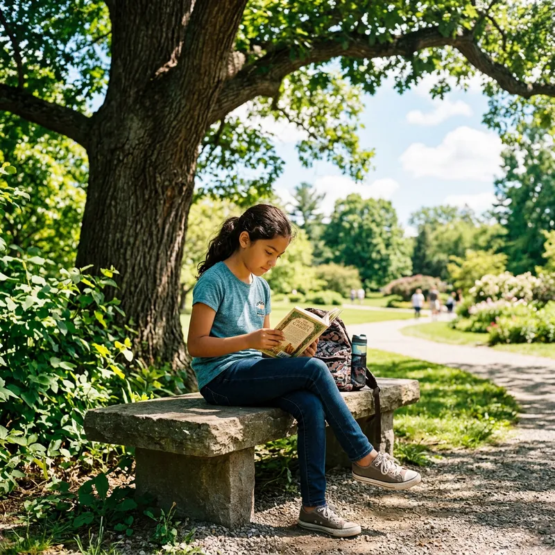 An image showing a young Hispanic girl. She has dark, wavy hair tied back in a ponytail and olive skin. She is wearing a casual t-shirt and jeans while sitting on a stone bench in a well-kept park. She is reading a book under the shade of a sprawling oak tree. The environment around her is filled with the colors of a sunny afternoon, with lush green grass and clear blue skies behind her.