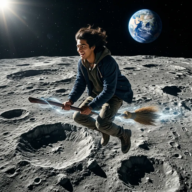 A young Hispanic male is seen flying on a broomstick over the craters of the moon. The desolated lunar landscape is illuminated by the distant sun, casting long and wavering shadows over the uneven surface. The young man, with dark, windswept hair, is shown joyously maneuvering the broomstick, his clothes fluttering in the imaginary lunar wind. His eyes gleam with the thrill of the magical flight, and the broomstick beneath him seems to hum with untapped energy. This breathtaking armature creates a stunning contrast between the lunar craters' barrenness and the lively energy of the fantastical scene.