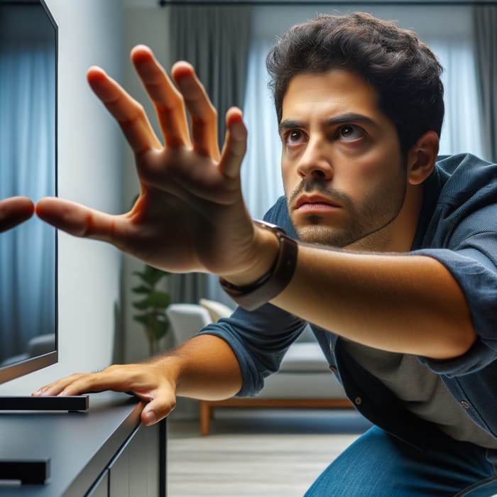 A young Hispanic man reaching out towards a television screen as if trying to grab something from within it, yet unable to do so. He's situated in a modern living room setting, with a look of intense concentration on his face as his fingers seem to be just brushing against the flat surface of the screen.