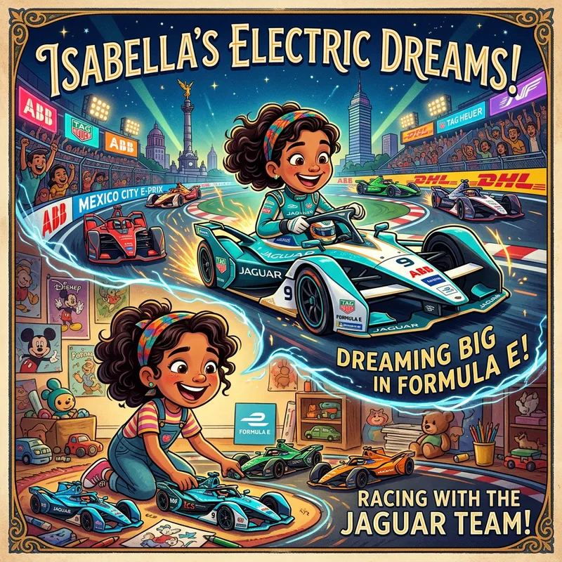 A vibrant, caricaturish poster featuring an abundance of colors and intricate details typical of early 20th-century animation styles. The poster showcases an animated 3D image of a young female race car enthusiast of Hispanic descent, amusing herself with Formula E toy cars and indulging her dreams of being a professional Formula E racer for a team she admires. She has joy in eyes and determination written across her features, her aspirations transported by her imagination to the electric atmosphere of a Formula E racing track.