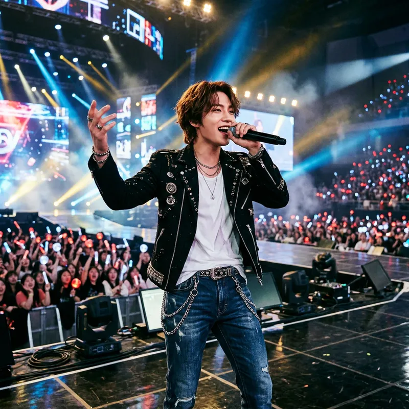 An image of a charismatic young male Korean idol with a captivating presence. He stands on a stage, adorned in stylish performance attire that includes a black jacket, white shirt, and jeans accessorized with chains. His hair is brown and styled into an effortless, slightly wavy style, and his facial features exude warmth and sincerity. His hand holds a microphone as he belts out a tune with pure passion, under the bright stage lights.