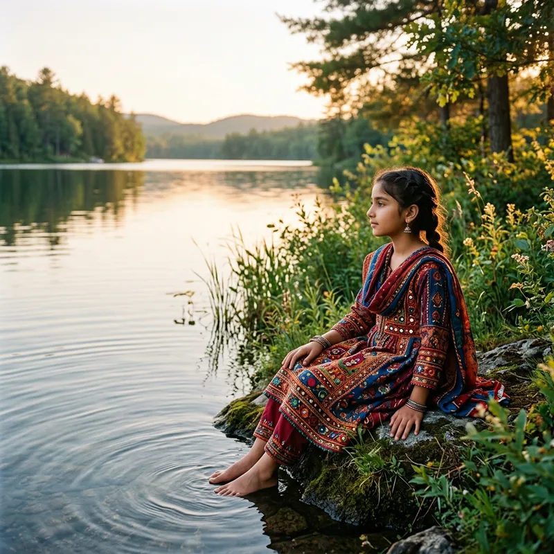 A young Pakistani girl wearing a beautifully detailed traditional dress. She is sitting peacefully beside a serene lake, her bare feet gently skimming the water surface. The environment is filled with greenery and the calm atmosphere suggests it is late afternoon. Her expression is one of serene tranquility as she gazes out over the placid waters, lost in thought. Her dress consists of vibrant colors and intricate patterns, reflecting the rich cultural heritage of her country. The sunlight filters through the surrounding trees, casting a warm atmospheric glow over the scenic location.