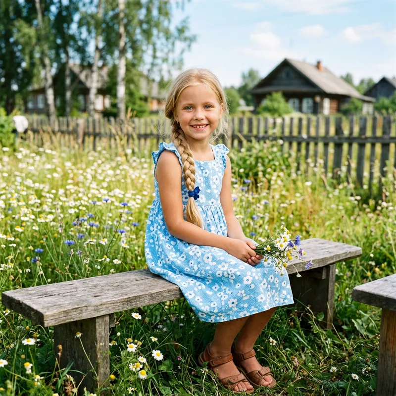 Photo of a young Russian girl wearing a blue sundress. She has long blonde hair that is tied up in a braid. Her eyes are bright and blue, reflecting the innocence and joy of childhood.
