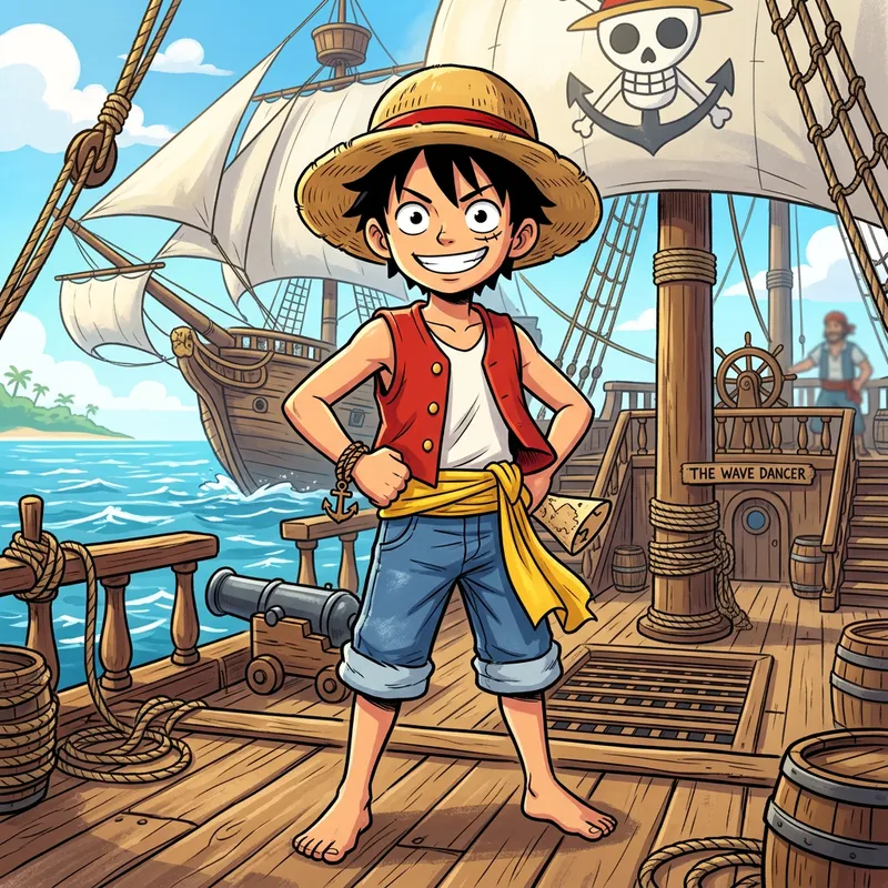 A cartoon styled illustration of a young seafaring boy with short black hair, wearing a red vest, blue denim shorts and a yellow sash tied around his waist. He sports a straw hat and is grinning confidently.