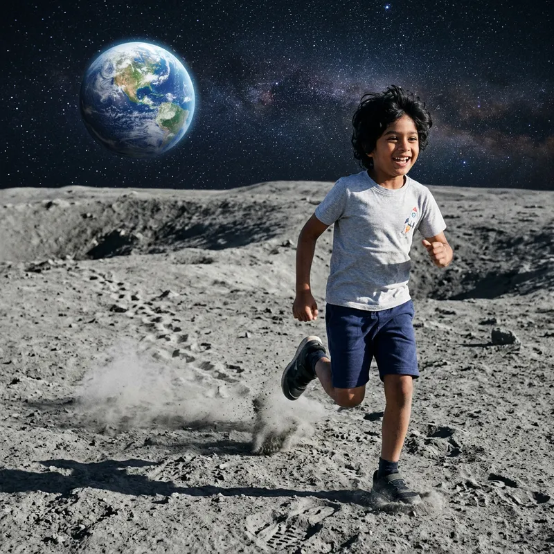 A young South Asian boy, with black, wavy hair and dark eyes, dressed in a casual outfit consisting of a light-colored t-shirt and navy blue shorts. He's engaged in a fascinating activity on the celestial body known as the moon. The boy, looking joyous and energized, is running on the moon's crater-filled surface, kicking up dust as he speeds along. His face is glowing, reflecting wonder and excitement. In the distance, you can see Earth, a shimmering blue sphere, providing a breathtaking backdrop. Extra details such as the stars, universe, and the boy's footprints reflecting on the moon's surface would ad depth to the scene.