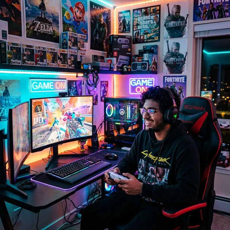 Young South Asian Gamer in Brightly Lit Room