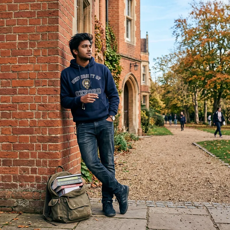 A South Asian male student in his early 20s, wearing a university sweatshirt and jeans, is casually leaning against the corner of a red brick university building. He holds an unlit cigarette in his hand, looking pensive. His backpack rests on the ground beside him, filled with textbooks and notebooks. In the background, amidst a campus setting, a path leads off into a lightly wooded area with young trees and a clear, blue sky overhead.