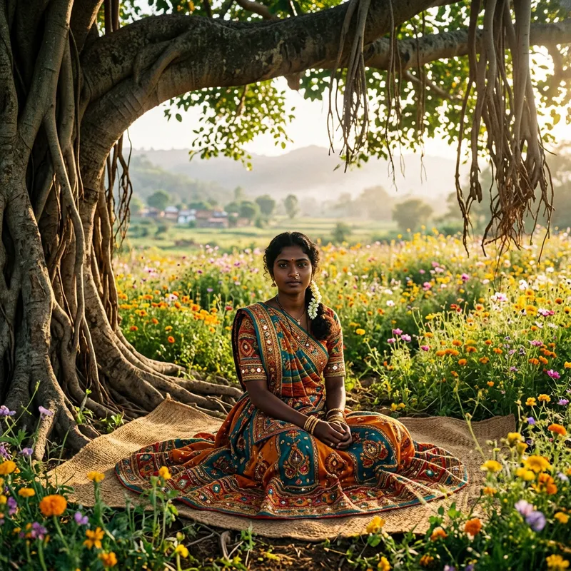 Visualize a depiction of a young South Asian woman. She has dark, curly hair neatly tied back. She is wearing colorful traditional attire, with intricate patterns and bright colors. She carries a serene expression and her dark eyes look straight ahead, reflecting perseverance. She is seated under the shade of a large, ancient banyan tree in the midst of a vibrant, sun-drenched field bursting with wildflowers. The setting has a mystical quality, with the woman seeming as a strong, grounded figure within it.