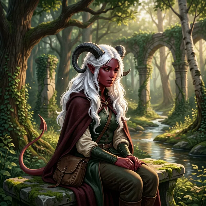 A young Tiefling character, embodying the exceptional attributes of this mythical race, notable for their infernal heritage and distinctive features. This particular individual is uniquely dignified with an abundance of long, shiny white hair cascading down their shoulders. Their horns are gently curved, sinewy skin holds a deep hue while eyes possess an enigmatic gleam. No common creature, but an expression of unworldly yet contemplative beauty, their form artistically positioned in the midst of a tranquil setting.