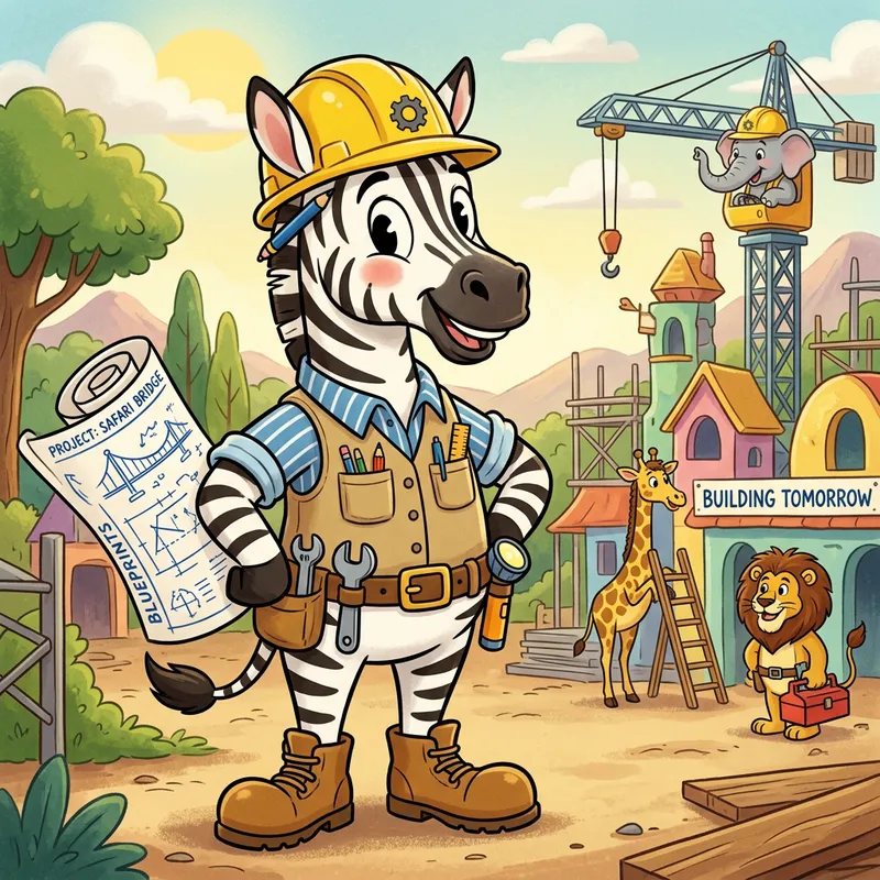 A zebra dressed up as an engineer. Picture the zebra standing upright, wearing a hard hat on its head and holding a set of blueprints under its hoof. The style of the image should be cartoonish, vibrant, and appealing to children, employing a playful color palette and simplified shapes characteristic of early 20th-century animation.