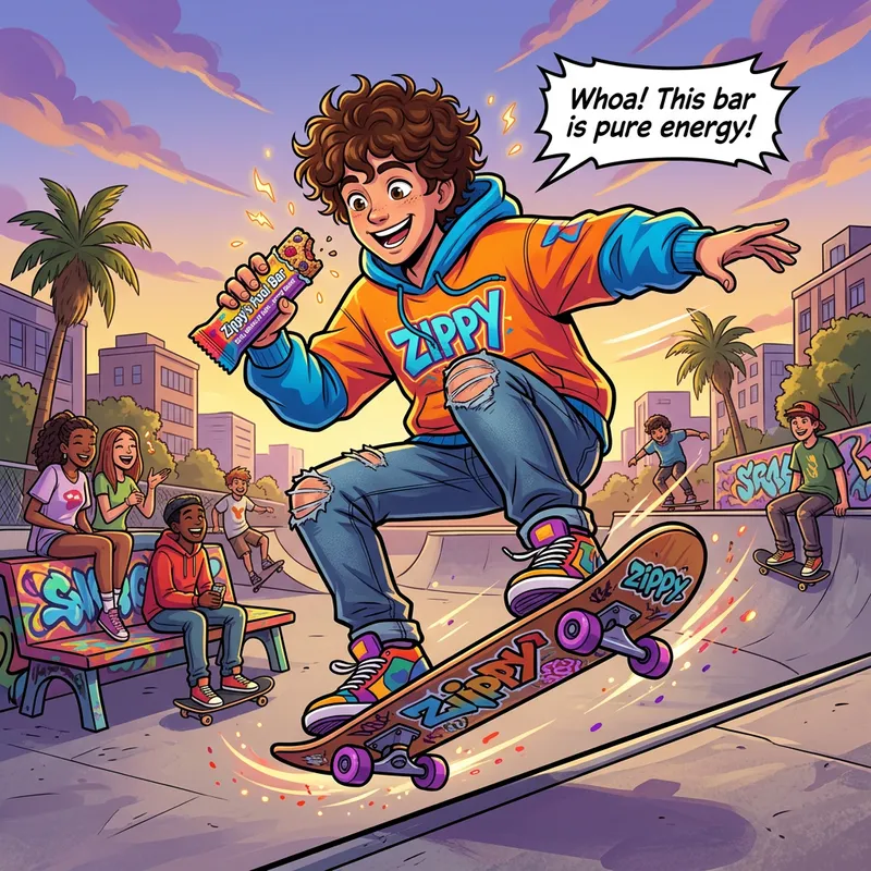 A fun, lively figure named Zippy is depicted engaging in a cool activity. He's skillfully maneuvering a skateboard, passionately dancing to an upbeat rhythm, or adeptly playing a melodic musical instrument. As he indulges in these pursuits, he's joyfully munching on a healthy energy-boosting snack. His enthusiastic demeanor vividly showcases the snack's invigorating qualities, making it an appealing choice for active teenagers.