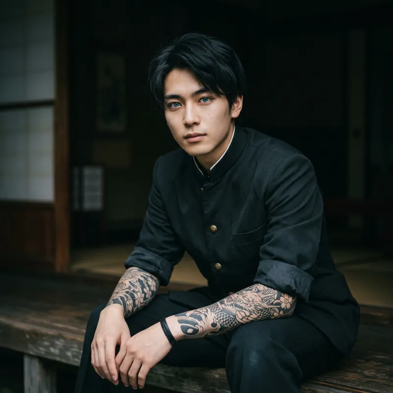 An image of a young man with black hair and bright blue eyes. He is dressed in a traditional Japanese uniform with the sleeves rolled up, revealing intricate black ink designs on his forearms. His expression is calm and collected, and there's a certain mystery in his eyes. The background of the image is a gradient of dark shades, providing an atmospheric setting while still drawing attention to the central character.