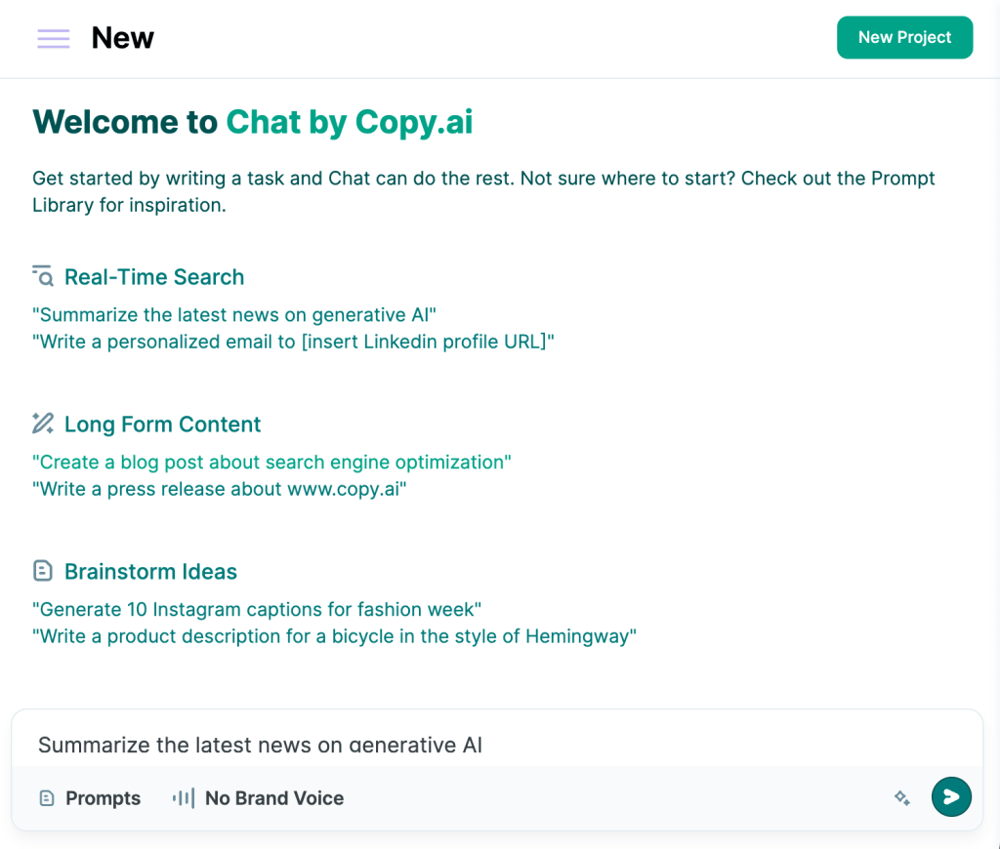 Copy.ai stands out as a text generation platform that focuses on writing copy. Like Easy-Peasy.ai, Copy.ai comes with pre-built templates to help you create content more efficiently. You can chat with the AI on one side of the screen and add the standout ideas to the text editor on the right.