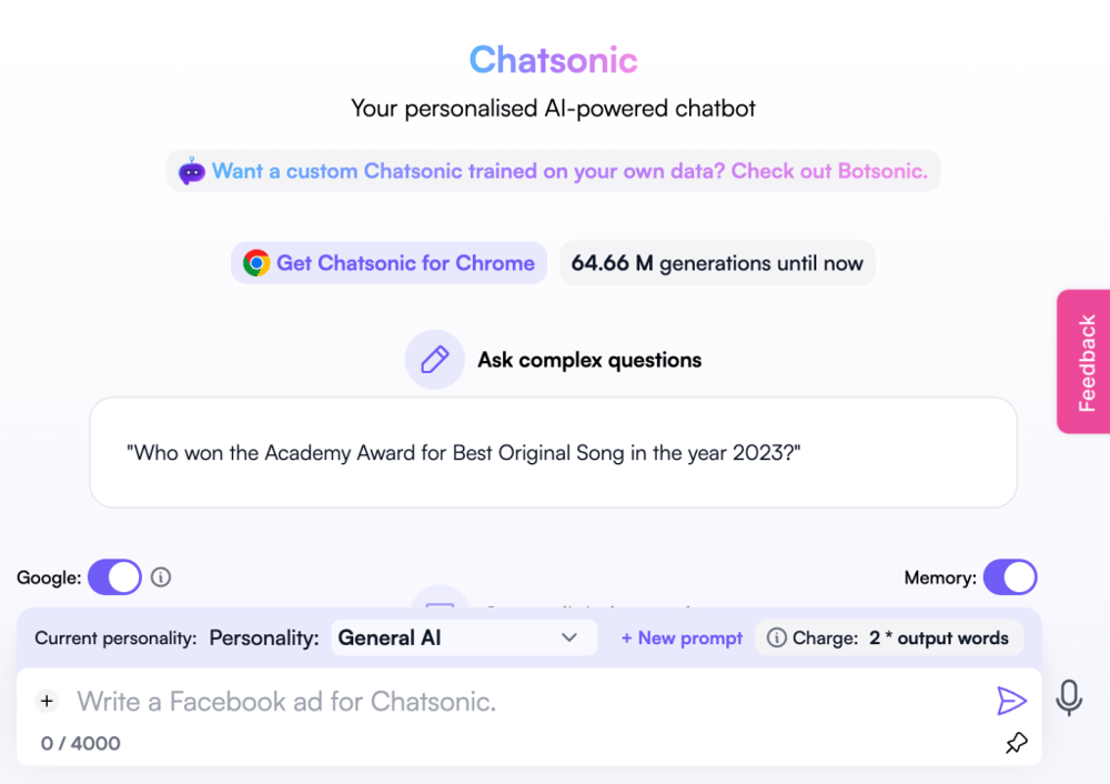 Chatsonic is Writesonic’s answer to AI chatting. It’s tailored for content production at scale, making it an ideal tool for bloggers and social media influencers. It can fetch internet sources, keep track of conversational information, and provides features like voice-to-text and text-to-voice.