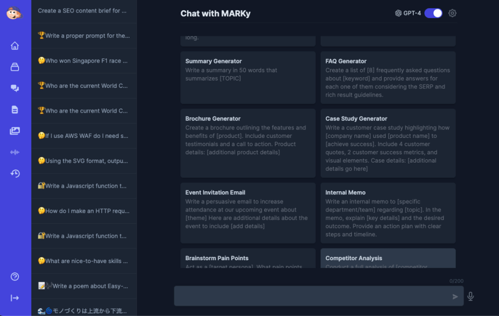 With GPT-4 and Claude 2 as the backbone, Marky represents the next generation of AI chatbots. The combination of empathy, knowledge, creativity, and personalization makes Marky the ultimate AI companion for work, research, or entertainment. Chat with Marky today to elevate your AI experience to new heights!