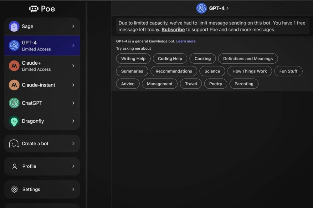 Poe is an AI chatbot that steps it up a notch. It doesn’t just connect to GPT-3 or GPT-4, it connects to multiple AI models, including Sage, Dragonfly, and Claude. This gives Poe a unique dynamism and flexibility in handling tasks.